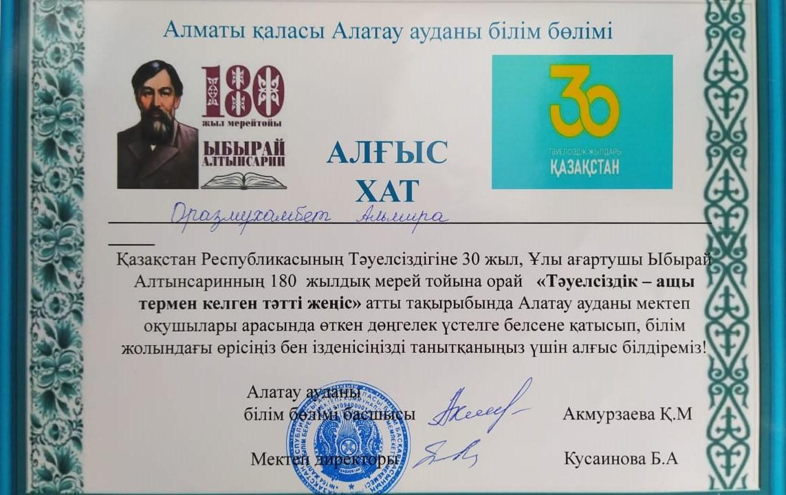 Қазақстан Республикасы Тәуелсіздігіне 30 жыл, Ұлы ағартушы Ыбырай Алтынсариннің 180 жылдық мерейтойына орай "Тәуелсіздік - ащы термен келген тәтті жеңіс" атты тақырыпта Алатау ауданы мектеп оқушылары арасында өткен дөңгелек үстелге белсене қатысып, білім жолындағы өрісі мен ізденісі үшін мектебіміздің 8-сынып оқушысы Оразмұхамбет Альмира Алғыс хатпен марапатталды. Құттықтаймыз!