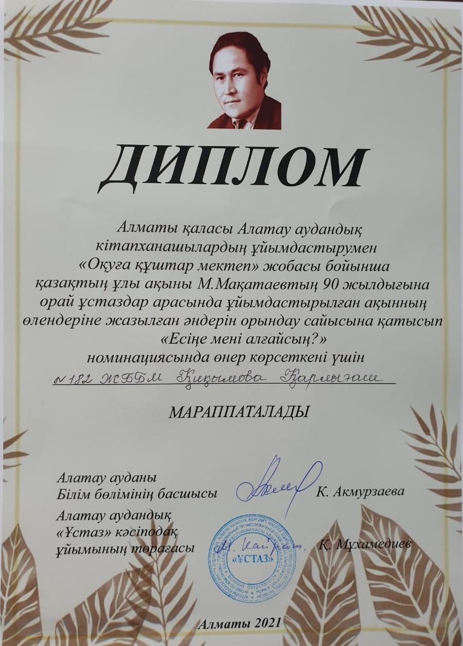 Алатау ауданы кітапханашыларының ұйымдастыруымен "Оқуға құштар мектеп" жобасы бойынша қазақтың ұлы ақыны М.Мақатаевтың 90 жылдығына орай ұстаздар арасында ұйымдастырылған ақынның өлеңдеріне жазылған әндерін орындау сайысына қатысып, "Есіңе мені алғайсың?" номинациясында өнер көрсеткені үшін мектебіміздің қазақ тілі мен әдебиеті пәні мұғалімі Қиқымова Қарлығаш Дипломмен марапатталды.