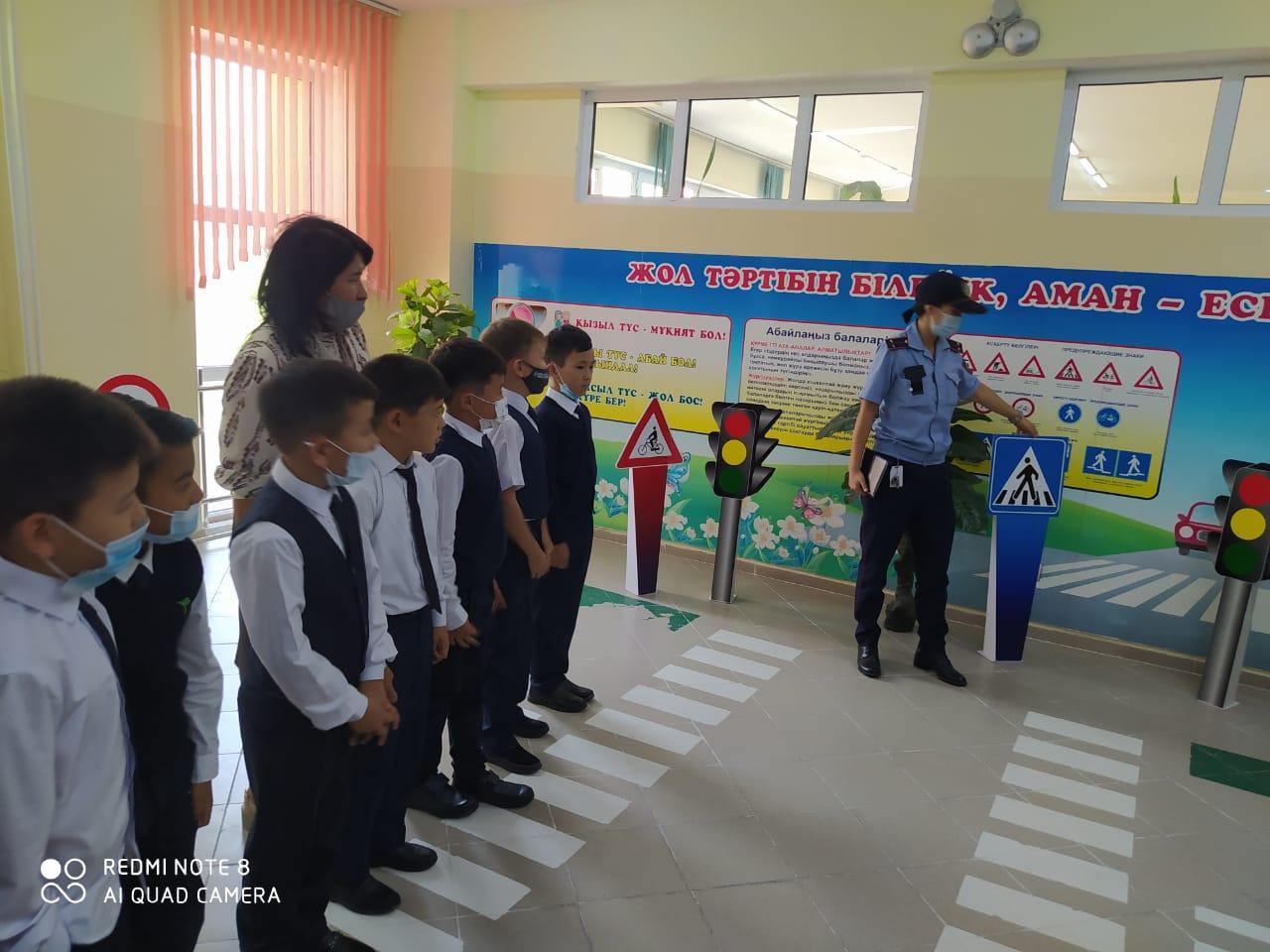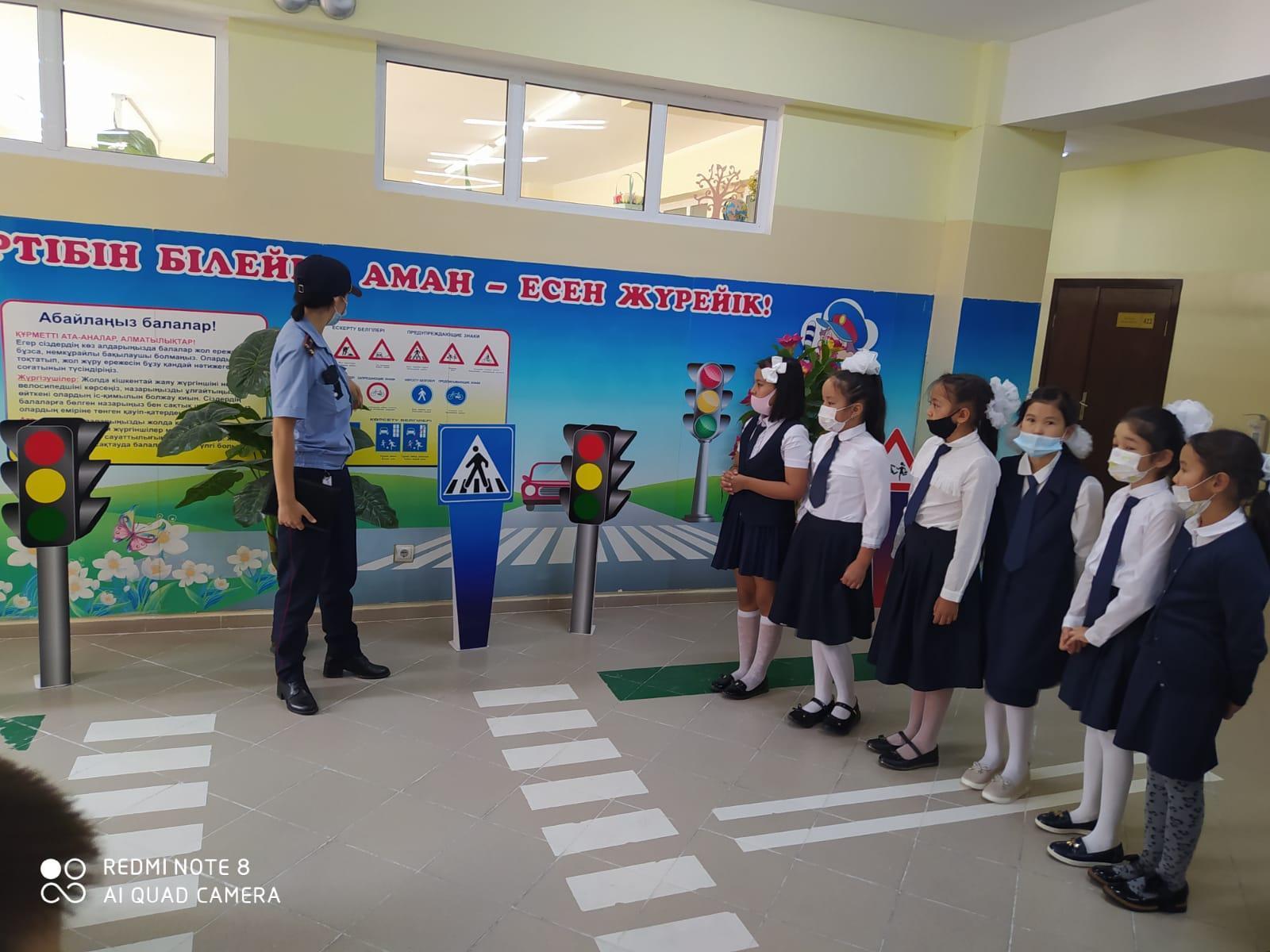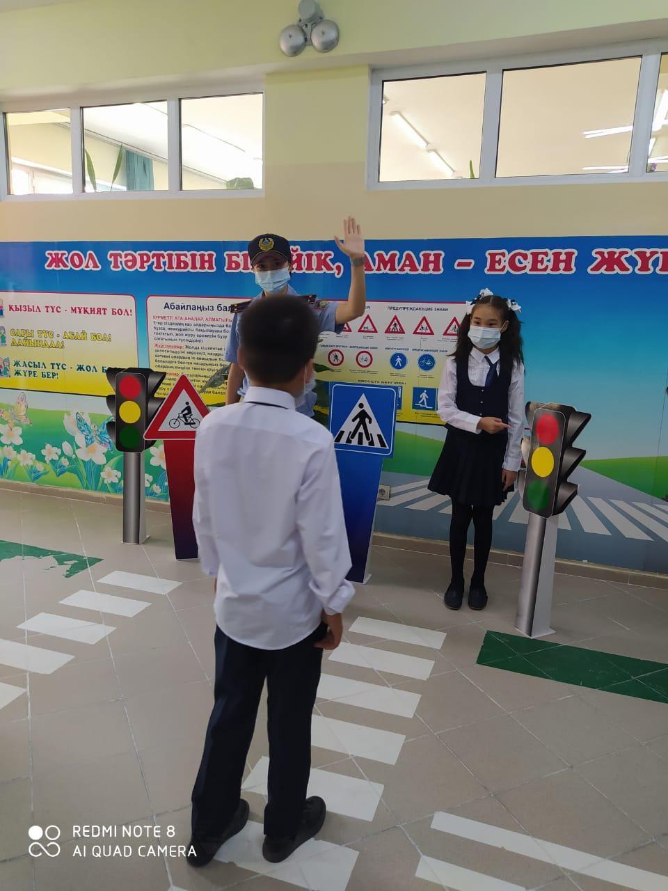 Мектебімізде «Абайла, балақай!» тақырыбында 1-4 сыныптар мен 5-11 сыныптың 3184 оқушысына мектеп инспекторы Нұрбек Айза түсіндірме жұмыстарын жүргізді. Түсіндірме жұмысының мақсаты: оқушылардың өмір қауіпсіздігі мен жол қозғалысы қауіпсіздігін сақтауды насихаттау. 1-4 сынып оқушыларына бейнероликтер көрсетілсе, 5-11 сынып оқушыларына таныстырылым слайдтары қолданылды. Аталған айлыққа орай «Менің мектепке келетін қауіпсіз жолымның сызбасы» атты күнделікке үй мен мектеп арасындағы жол сызбасы көрсетілді, мектептің маңайында, ықшам аудандағы қауіпті деп саналатын аймақтар туралы түсінік берілді. Ата-аналарға арналған «Жол қозғалысын жатқа біл» тақырыбында оқушыларға арналған үнпарақтар таратылды. Аудандық жол қозғалысы бөлімінен тексеріс те жүргізілді. Мектепте жол қозғалысын дәріптейтін бұрыш бастауыш сыныптардың дәлізінде орналасқан. 1-11 сынып жетекшілері «Жол қозғалысын білу міндетің» тақырыбында сынып сағаттарын өткізді.