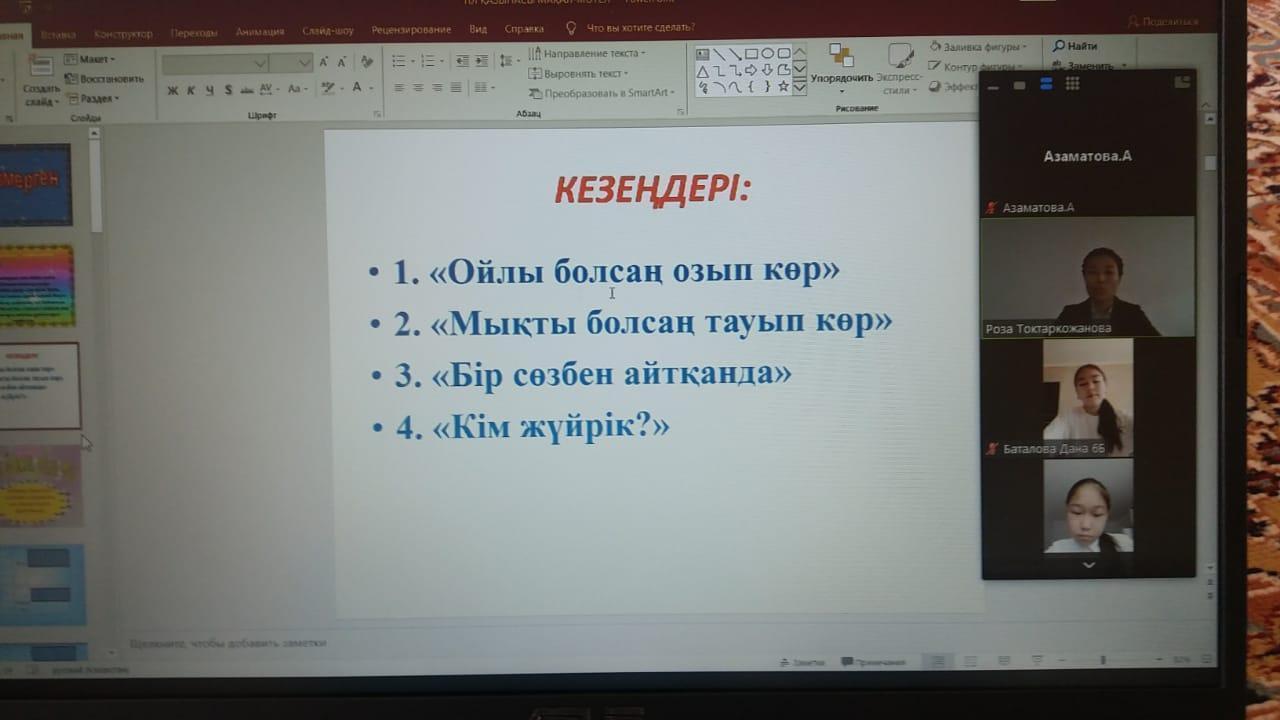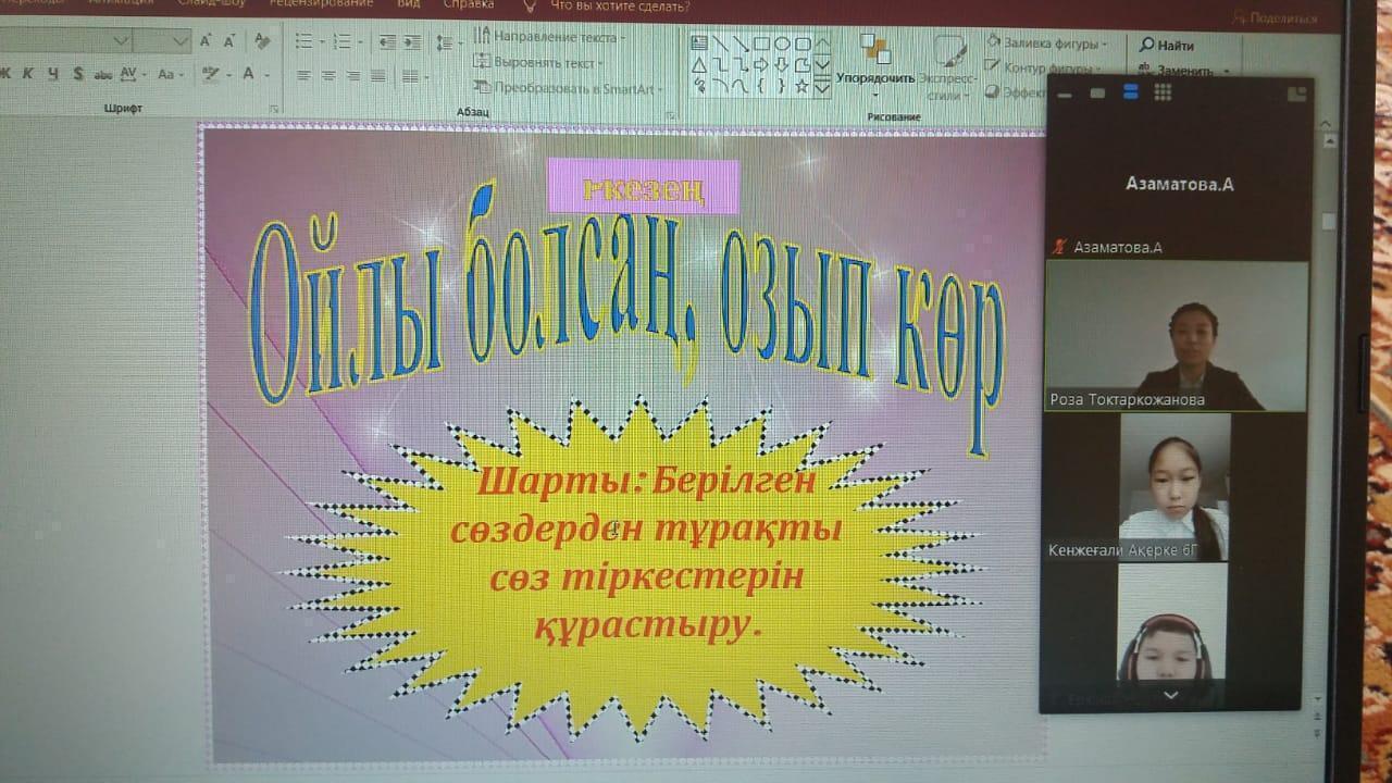 Қазақ тілі мен әдебиеті пән бірлестігінің "Ана тілім-асыл қазынам" атты апталығы барысында пән мұғалімдері Токтаркожанова Р.Б., Исимова Ж.Ә. 6-сыныптар арасында сыныптан тыс "Тіл қазынасы – мақал-мәтел" тақырыбында сайыс сабағын өтті. Мақсаты: оқушылардың ана тіліне деген сүйіспеншілігін арттыру. Ана тілінің қадір - қасиетін біліп, көркемдігін сезініп, еркін сөйлей білуге, үйрету, ойлау қабілетін, тіл байлығын дамытуға бағыттау, тәуелсіз еліміздің ана тілін жоғары қоятын ұрпақтарын тәрбиелеу. Сайыс кезеңдері: