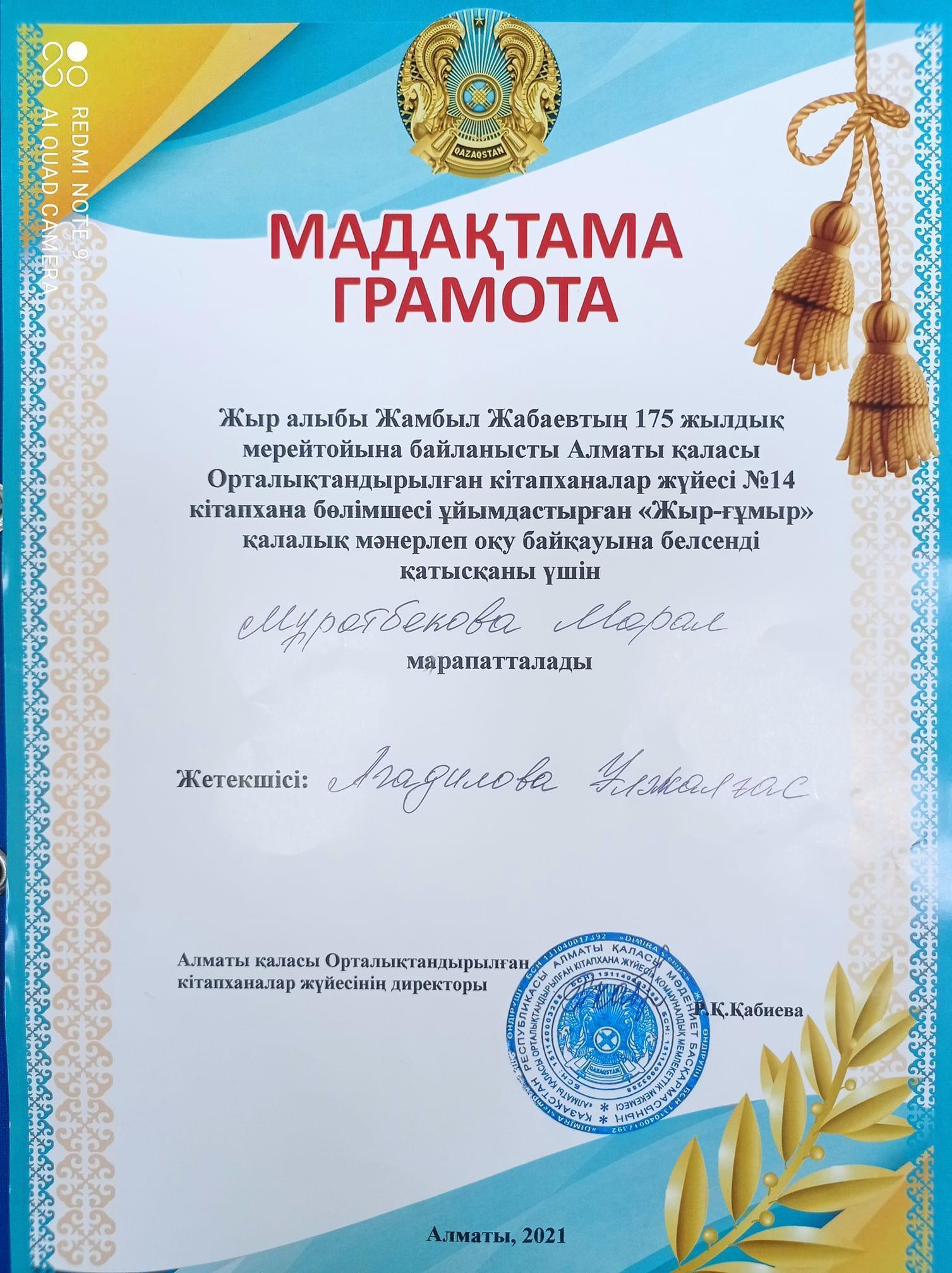 Жыр алыбы Жамбыл Жабаевтың 175 жылдық мерейтойына орай Алматы қаласы Орталықтандырылған кітапханалар жүйесі №14 кітапхана бөлімшесі ұйымдастырған "Жыр-ғұмыр" қалалық мәнерлеп оқу байқауына белсене қатысқаны үшін оқушымыз Мұратбекова Марал Мадақтама қағазымен марапатталды. Жетекшісі У.Б.Агадилова. Құттықтаймыз!