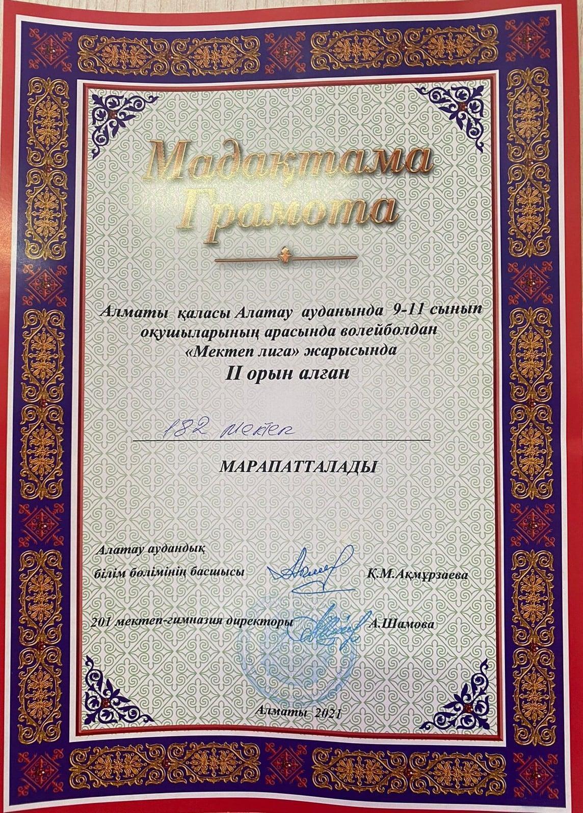 13 қазан 2021 0 1 2 3 4 5 Оқушыларымыздың жетістіктері ОҚУШЫЛАРЫМЫЗДЫҢ ЖЕТІСТІКТЕРІАлматы қаласы Алатау ауданы мектептерінің 9-11 сынып оқушыларының арасында волейболдан "Мектеп лига" жарысында мектебіміздің оқушылары ІІ орынға ие болды. Құттықтаймыз! Осы беттің QR-коды:QR-код этой страницы: