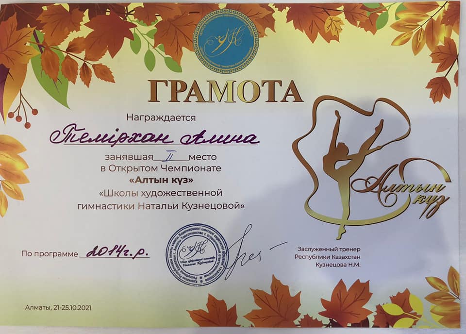 22 қазан 2021 0 1 2 3 4 5 Оқушыларымыздың жетістіктері ОҚУШЫЛАРЫМЫЗДЫҢ ЖЕТІСТІКТЕРІМектебіміздің бастауыш сынып оқушысы Темірхан Алина "Наталья Кузнецованың көркем гимнастика мектебінің " Алтын күз" ашық чемпионатында ІІ орынға ие болды. Құттықтаймыз! Талабыңызға нұр жаусын! Осы беттің QR-коды:QR-код этой страницы: