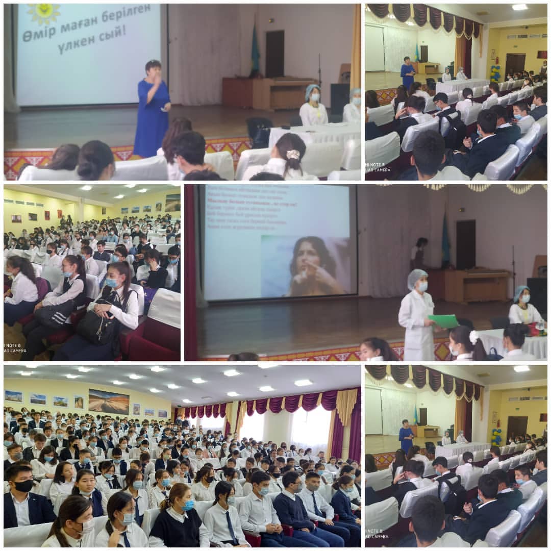 Қалалық психикалық сауықтыру орталығының телімдік психиатр-наркологы С.Б.Кенесбекова оқушыларға ПБЗ (психо-белсенді заттарды) қолданудың алдын-алу бойынша жадынама таратты. Лекция барысында оқушыларға «ПБЗ қолданудың алдын алу» тақырыбында бейнефильм көрсетілді.