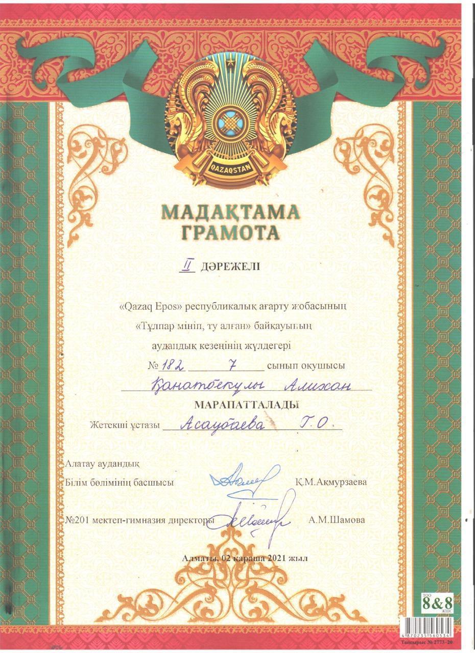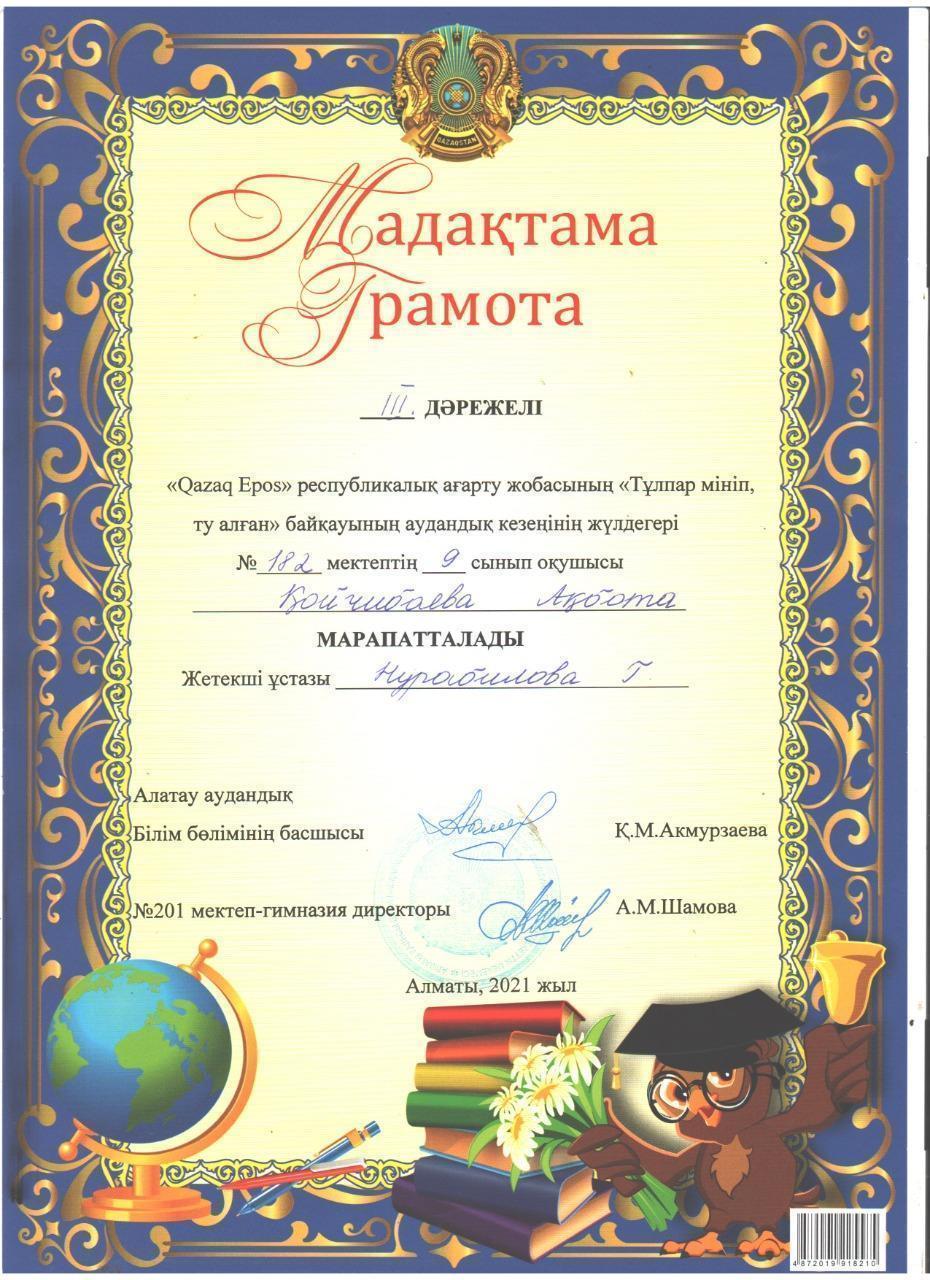 "Qazaq Epos" республикалық ағарту жобасының "Тұлпар мініп, ту алған" байқауының аудандық кезеңінде мектебіміздің 7-сынып оқушысы Қанатбекұлы Алихан ІІ дәрежелі, 9-сынып оқушысы Қойчибаева Ақбота ІІІ дәрежелі Дипломдармен марапатталды. Жетекшілері қазақ тілі мен әдебиеті пәнінің мұғалімдері Г.Нурабилова мен Г.О.Асаубаева. Құттықтаймыз!