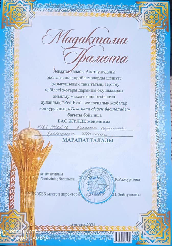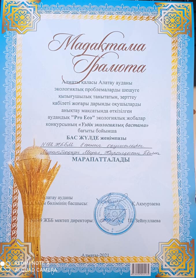 Алатау ауданы мектеп оқушылары арасында экологиялық проблемаларды шешуге қызығушылық танытатын, зерттеу қабілеті жоғары дарынды оқушыларды анықтау мақсатында өткізілген аудандық "Pro Eco" экологиялық жобалар конкурсында "Үздік экологиялық бастама" бағыты бойынша 8-сынып оқушылары Мұратбекқызы Марал мен Жарылқасын Даяна Бас жүлдеге, "Таза қала сізден басталады" бағыты бойынша 8-сынып оқушысы Ерсінқызы Шолпан Бас жүлдеге ие болып, байқаудың қалалық кезеңіне жолдама алды. Құттықтаймыз! Оқушыларымызға сәттілік тілейміз!