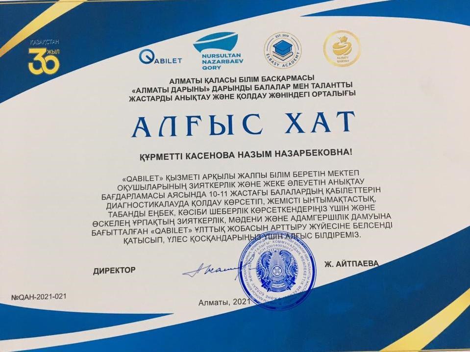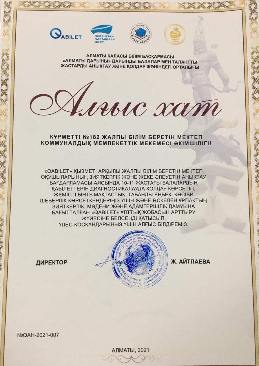 Алматы қаласы Білім басқармасы "Алматы дарыны" дарынды балалар мен талантты жастарды анықтау және қолдау орталығы №182 жалпы білім беретін мектеп әкімшілігі мен педагог-психологі Касенова Назым Назарбековнаның "QABILET" қызметі арқылы оқушылардың зияткерлік және жеке әлеуетін анықтау бағдарламасы аясында 10-11 жастағы балалардың қабілеттерін диагностикалауда қолдау көрсетіп, жемісті ынтымақтастық, табанды еңбек, кәсіби шеберлік көрсеткендері үшін және өскелең ұрпақтың зияткерлік, мәдени және адамгершілік дамуына бағытталған "QABILET" ұлттық жобасын арттыру жүйесіне белсенді қатысып, үлес қосқаны үшін Алғыс хатпен марапаттады. Құттықтаймыз!