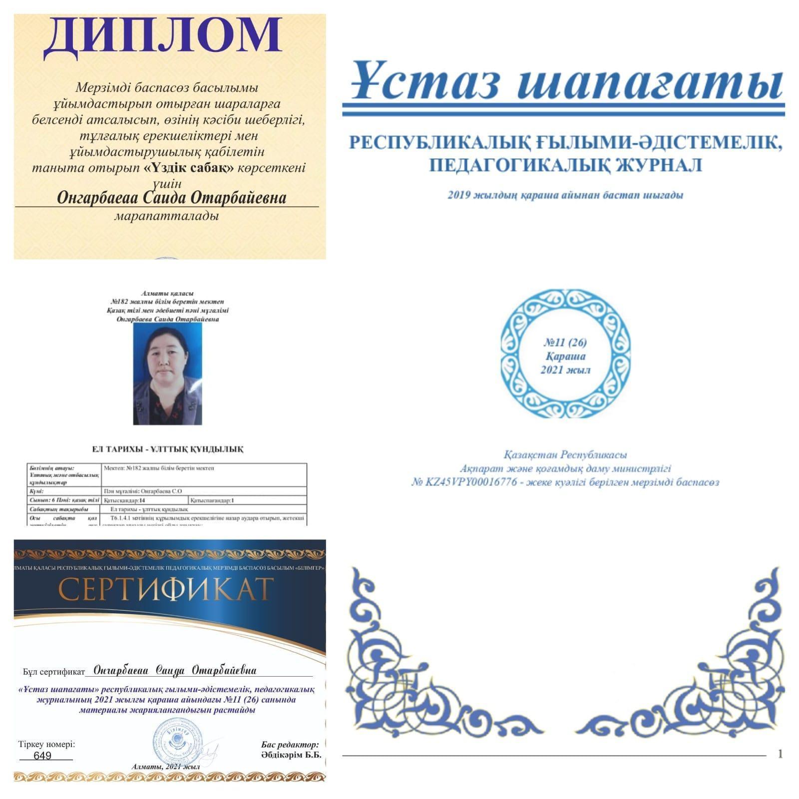 Мектебіміздің қазақ тілі мен әдебиеті пәні мұғалімі Онгарбаева Саида Отарбайевнаның "Ұстаз шапағаты" республикалық ғылыми-әдістемелік педагогикалық журналында "Ел тарихы-ұлттық құндылық" мақаласы жарық көрді.