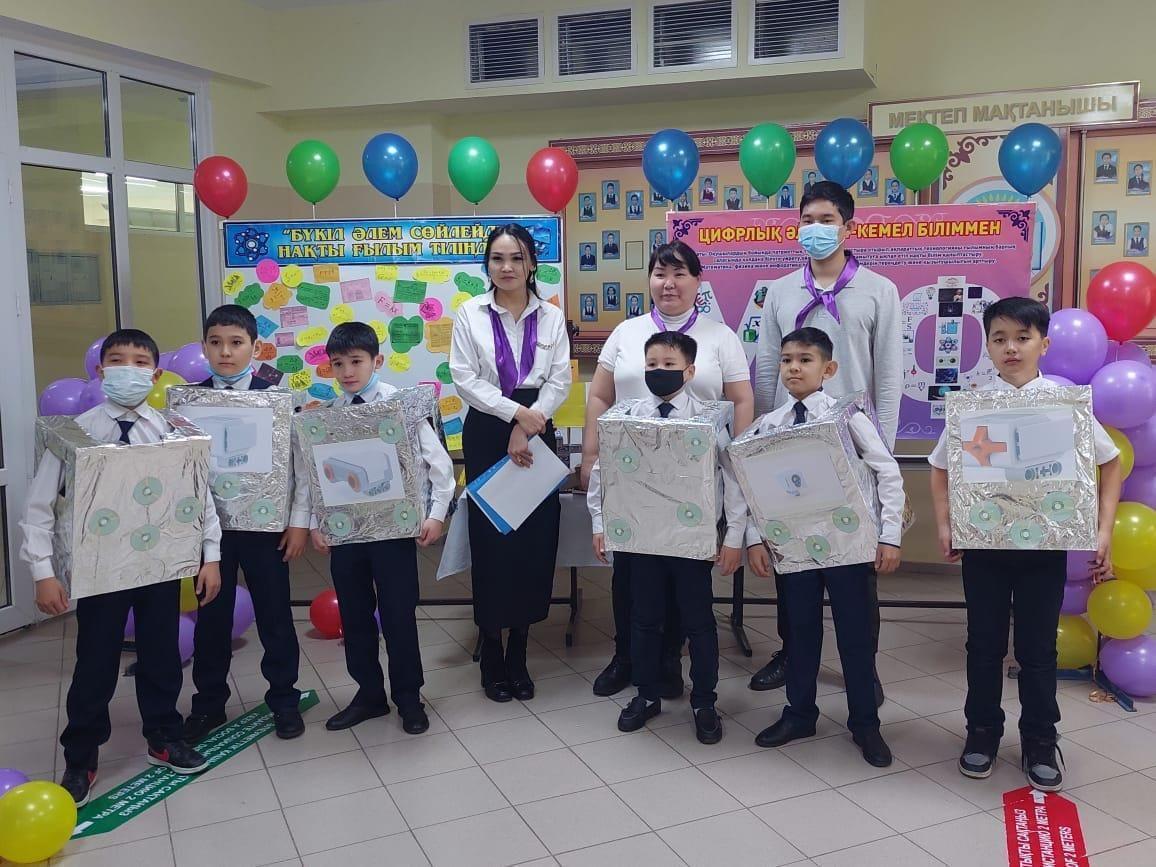Мектебіміздің информатика пән мұғалімі Әбжаппарова Жұлдыз Бөлегенқызы 4-сыныптар арасында «Роботтар әлеміне саяхат» тақырыбында сыныптан тыс жұмыс өткізді. Сабақ барысында қораптардан құрастырылып, жылтыр қағаздармен қапталған робот киімдер датчик (жанасу датчигі, ультрадыбыс датчигі, гироскопиялық датчик, түс датчигі) суреттері қолданылды және робот құрылғыларына қатысты жұмбақтар жасырылды.