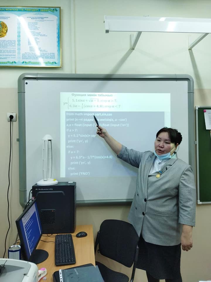 "Цифрлық әлемде-кемел біліммен" тақырыбы аясында МИФ апталығы барысында информатика пән мұғалімі Дюсупова Анар Кадылбековна 7 «В» сыныбымен «Құрамды шарттарды программалау» тақырыбында ашық сабақ өткізді. Сабақ барысында оқушылар Python тілінде есеп шығарып логикалық операцияларды практикада қолданды. Сабақта "Шаттық шеңберге" шығып ізгілік шарасын орнаттық, "Борт журналы" әдісі арқылы конспект жазды, топтық жұмыс арқылы кодтауды талдады, Python программасымен жұптық жұмыс жасау арқылы қолданды. Сабақты «Бес бармақ» әдісі арқылы қорытындылады.
