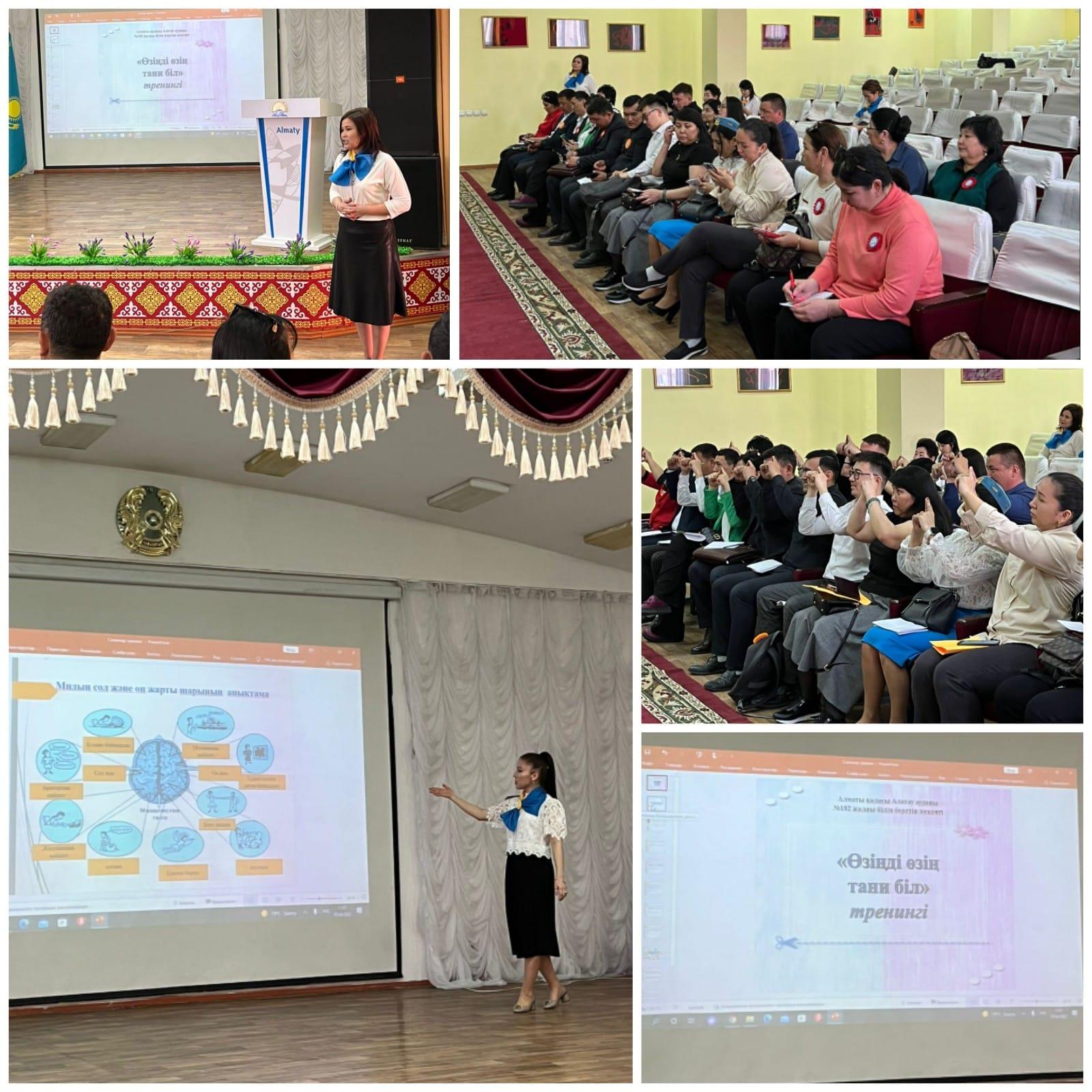 Мектебімізде «Цифрлық трансформациялау жағдайында басқарушылық шешімдерді қабылдауда белсенді және инновациялық әдістерді қолдану» тақырыбында өткен республикалық семинарда ұсынылған «Өзіңді-өзің тани біл» тренингі. Жауапты мектеп педагог-психологі Балтабаева А.С.