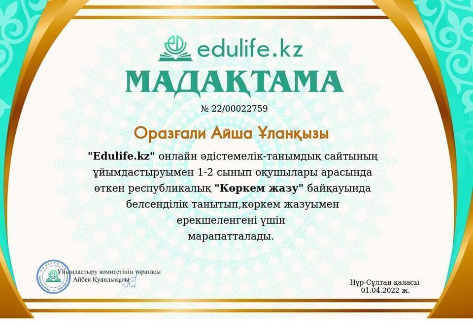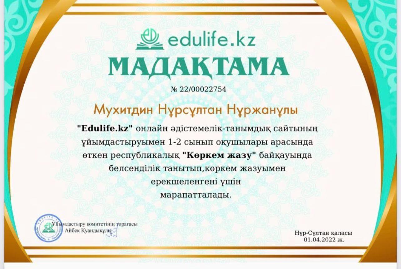 Мектебіміздің бастауыш сынып оқушылары Оразғали Айша Ұланқызы мен Мухитдин Нұрсұлтан Нұржанұлы 1-2 сынып оқушылары арасында өткен республикалық "Көркем жазу" байқауында белсенділік танытып, көркем жазумен ерекшеленгені үшін Мадақтама қағазымен марапатталды. Жетекшісі бастауыш сынып мұғалімі Емілтаева Әйгерім. Құттықтаймыз!