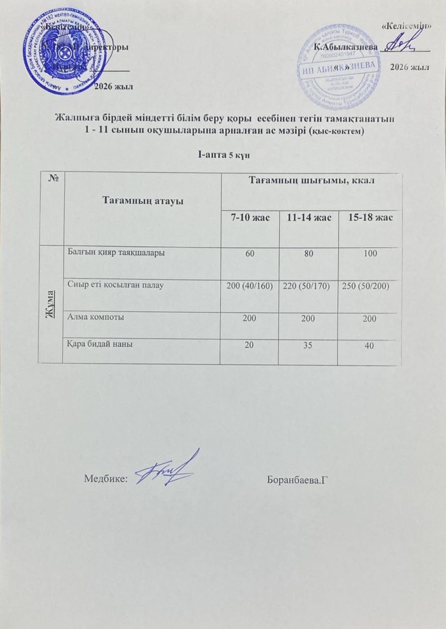 » Ас мәзірі 1 апта 5 күн